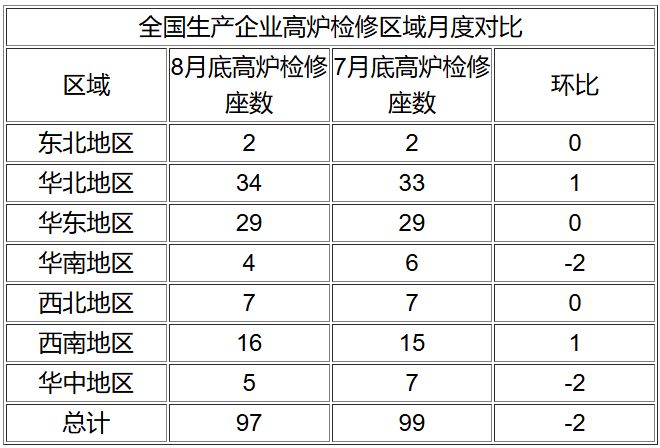 8月底,201家样本高炉企业中,有97座高炉检修,较7月底减少2座。其中:东北地区2座高炉检修,较上月底持平;华北地区34座高炉检修,增加1座高炉检修;华东地区29座高炉检修,持平;华南地区4座高炉检修,减少2座高炉检修;西北地区7座高炉检修,持平;西南地区16座高炉检修,增加1座高炉;华中地区5座高炉检修,2座高炉恢复开工。