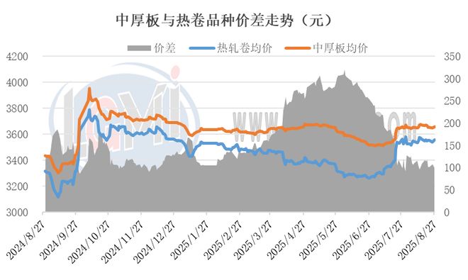 8月中厚板走势弱于热卷市场表现。截止到8月27日,国内中厚板品种月度均值为3658元,热卷品种月度均值为3549元,两者价差均值为111元,较7月份均值收窄54元。8月份热卷涨幅明显要快于中厚板表现,部分钢厂铁水存在从中厚板转向热卷的情况。
