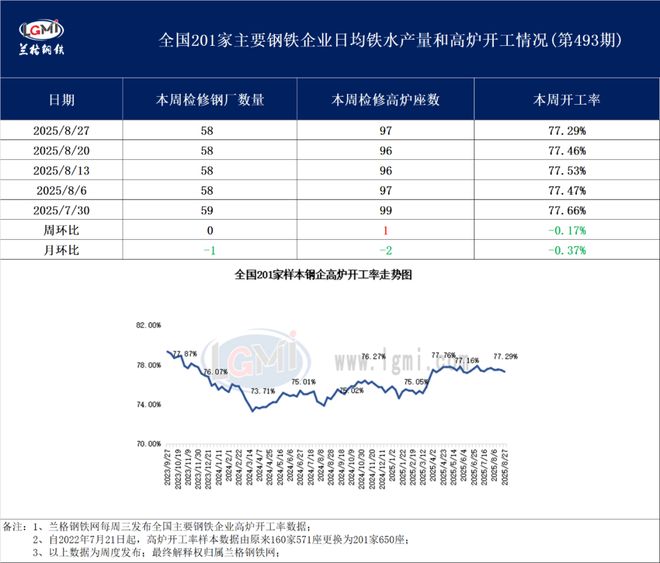 据兰格钢铁网监测数据显示,截止到8月底全国201家生产企业中有58家钢厂共计97座高炉检修停产,总容积为106450立方米,较7月底增加3920立方米,按容积计算主要钢铁企业高炉开工率为77.29%,较7月底下降0.37个百分点。