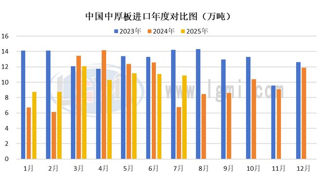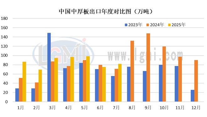 至于出口情况,据海关统计数据显示,7月份中厚板出口量为81.68万吨,环比增加6.4万吨,同比增加10.45万吨。2025年1-7月累计出口总量602.69万吨,同比增加103.38万吨。