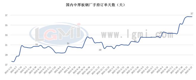 截止到8月27日,国内钢企手持订单均值为37天,较7月底增加2天。整体来看,一线企业手持订单天数保持在30-90天左右,二线天。从兰格钢铁网调研数据来看,部分钢厂中厚板接单量已经接至10月份,钢厂仍以生产品种钢为主。