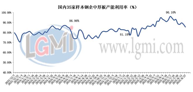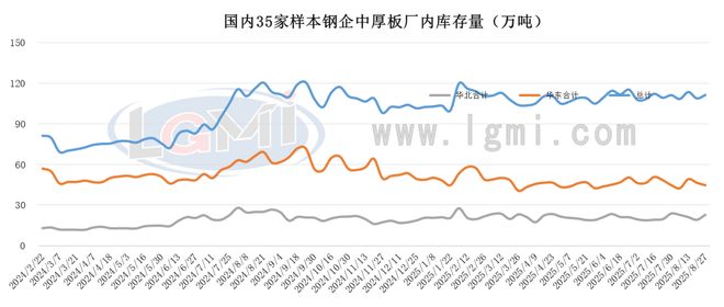 至于库存方面,截至8月27日,35家样本钢厂厂内库存量为111.58万吨,较7月底小幅下降0.16万吨,同比减少2.19万吨。8月份钢厂中厚板接单情况普遍较好,钢厂库存加速向社会库存转移,叠加8月份中厚板产量有所下降,双重影响下,8月份钢厂中厚板库存量小幅下降。