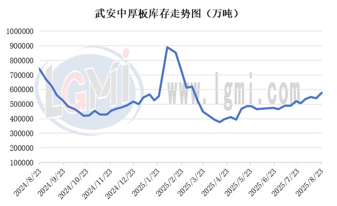 据兰格钢铁网监测数据显示,截至8月23日,武安地区中厚板库存57.90万吨,较7月底增加7.40万吨。8月份武安地区库存缓慢累库,主要原因有二:一是前期受限产消息和原料提涨因素影响,部分商家存在提前备货的情况;二是8月中下旬中厚板行情下行压力有所增加,下游采购需求不足,综合影响下,8月份武汉中厚板社会库存呈现温和增加的局面。