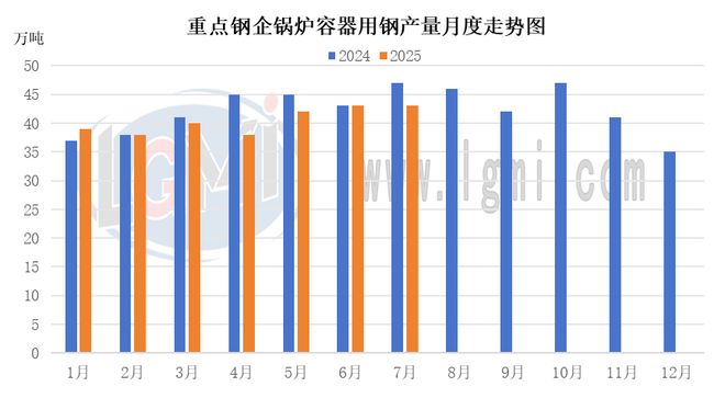 7月份锅炉容器钢产量窄幅波动。据中钢协统计数据显示,7月份国内重点35家生产企业,锅炉容器用钢单月产量为43万吨,环比增加0.7%,同比下降7.4%。1-7月份累计产量279万吨,同比下降7.4%。