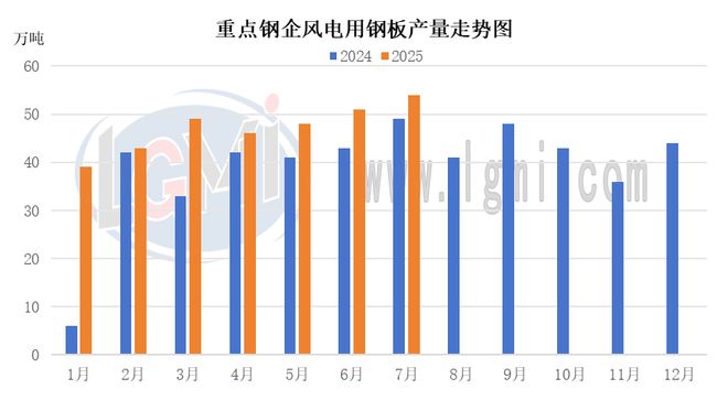 7月份风电用钢产量小幅增加。据中钢协统计数据显示,7月份国内重点35家生产企业,风电用钢单月产量为54万吨,环比增加6.2%,同比增加13.3%。1-7月份累计产量324万吨,同比增加28.2%。
