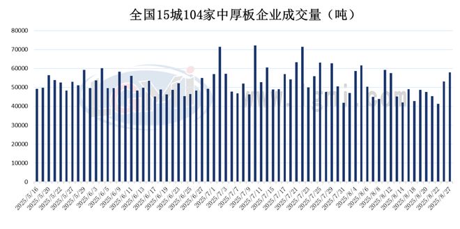 据兰格钢铁网监测数据显示,8月份国内15个重点城市104家中厚板贸易企业成交量日度均值为4.98万吨,较7月份小幅减少0.57万吨。8月份中厚板市场成交价格震荡盘整,下游业者观望情绪有所增加,入市采购需求表现谨慎。叠加终端需求恢复较为缓慢,也在一定程度上影响8月份中厚板企业成交量环比有所下降。