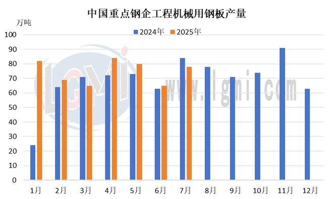 7月份工程机械用钢产量环比增长。据中钢协统计数据显示,7月份国内重点35家生产企业,工程机械用钢单月产量为78万吨,环比增长20.1%,同比下降7.8%。1-7月份累计产量527万吨,同比增长17%。