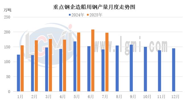 7月份船用钢产量小幅下降。据中钢协统计数据显示,7月份国内重点35家生产企业,船用钢单月产量为197万吨,环比下降5.1%,同比增长40.2%。1-7月份累计产量1252万吨,同比增加27%。